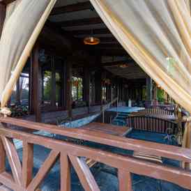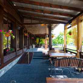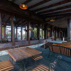 В ресторане необычная кованая мебель в стиле XIX века, в оформлении использовали оригинальные предметы декора, а особую изюминку придает панорамный вид на парковую зону водохранилища. В распоряжении гостей:
