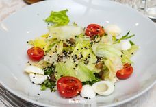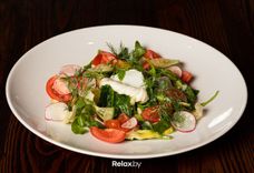 250 г • Руккола, шпинат свежий, сельдерей, томат Черри, моцарелла, шапиньоны, яйцо перепелиное, кедровый орех, заправка салатная