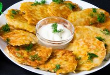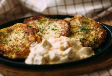 350/50/2 г • Колбаски домашние, драники картофельные, яйцо жареное, малосольный огурец, сметанный соус,зелень